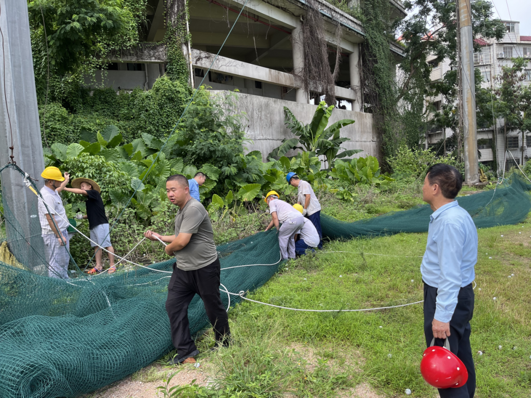 寶鷹建科迅速組織對所有在建項目的大型機械設備、工地的活動板房(辦公區、生活區)、圍擋、加工棚、安全網等臨時設施進行全面檢查和加固。對所有工地的臨時用電線路、配電箱(柜)進行排查,臺風來臨前切斷除應急照明、排水設備外的所有非必要電源,防止觸電和電氣火災事故。